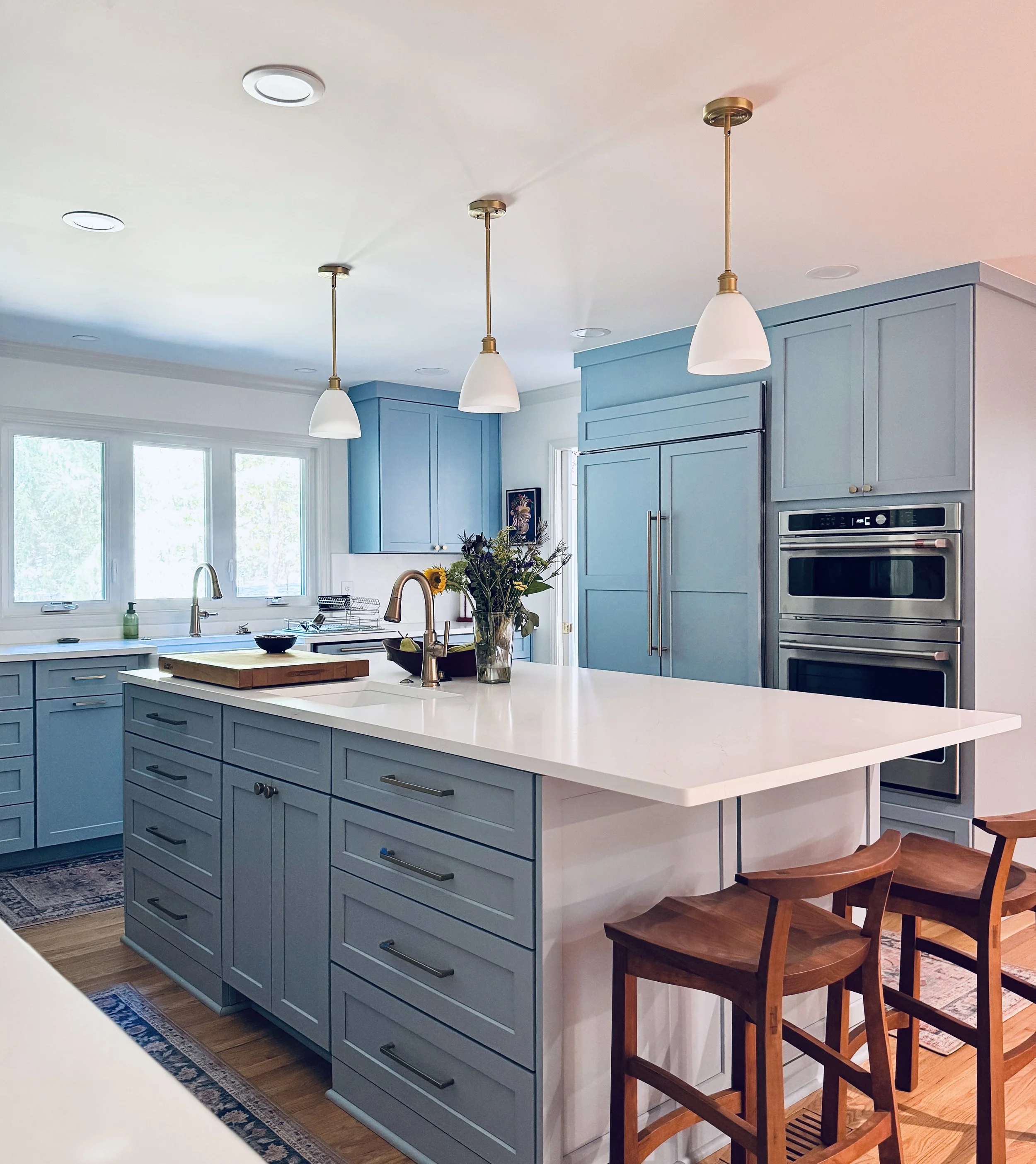 This renovation reworked the bathroom and mudroom spaces, along with the kitchen and entries to adjacent spaces to right-size each room for their needs, and create visual continuity between the adjacent spaces. This opened up space for a mudroom-pantry combo, tightened up the powder room, and expanded the kitchen for a more open and functional workflow. One side of the kitchen is dedicated to the cook, the other side to the baker, and the central island is a workspace for both. The old front window was replaced with a large triple window to bring in more light and expand the view of the front yard. The cabinetry is taller than standard to better suit the owners’ height, and the upper cabinets are raised as well for a more spacious countertop area. Other small touches add extra functionality, like the special mixer cabinet, a tall cubby for golf clubs, ample in-drawer spice racks, custom shelving in the pantry made for their various appliances, and electronic shades on the screened porch’s skylights.
