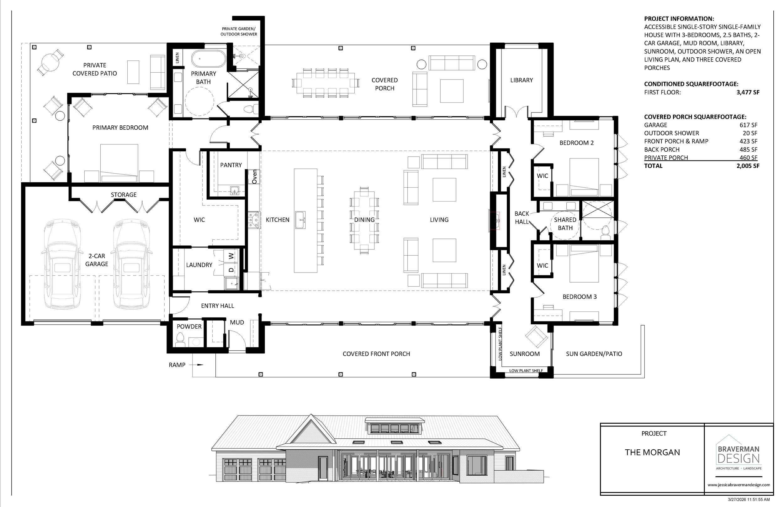 3-Bed, 2.5-Bath, One-Story Accessible Single Family Home with a 2-Car Garage, Mudroom, Library, Sunroom, 3 Covered Porches, and Outdoor Shower